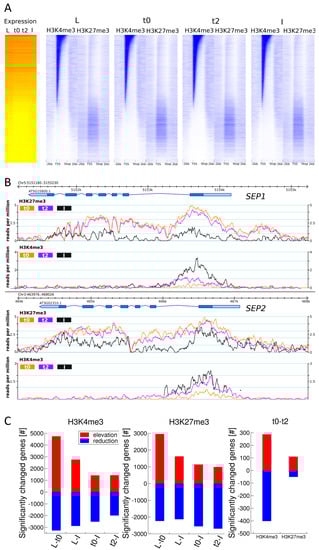 The examples of histone mark distribution over two important floral organ identity gene loci (SEP1 and SEP2) for t0, t2 and I (Figure 2B) indicate the presence of quantitative changes during flower morphogenesis. Particularly for H3K27me3, these changes are subtle but span a wide range of the marked region.