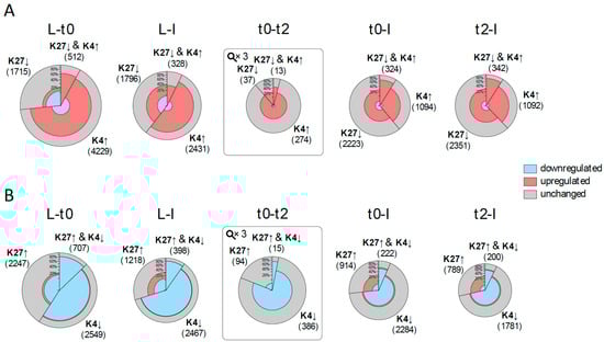 Correlation of changes in histone marks and expression changes prior to and during flower development. For each comparison between tissues/time points, two pies are drawn: (A) one for changes in histone marks which are expected to be correlated with activation (elevation (↑) of H3K4me3, reduction (↓) of H3K27me3); and (B) one for repression. The size of the pie circle represents the number of genes (for t0-t2 the size is zoomed three times) and is partitioned into three sectors, which sizes correspond to the number of genes changing in H3K4me3 (K4), H3K27me3 (K27) or both. Each sector is coloured according to the number of differentially expressed genes (DEGs) (from inside to outside: down-regulated genes (blue), up-regulated genes (red) and genes with no significant change in expression (grey).
