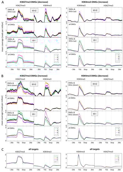 Since transcription is initiated by the assembly of the pre-initiation complex (PIC) near the TSS of a gene, histone marks might primarily change at this region to allow activation or repression of transcription. We thus analysed the marks average distribution along the locus for genes displaying changes during induction of flower development (DMG from t0 to t2 or I) (Figure 4). The t0-t2 and t0-I differences are clearly visible among the DMGs and occur rather uniformly over the covered regions than locally, except for a stronger change at the peak close to the TSS for H3K4me3 in the t0-t2 activation comparison. Changes in H3K4me3 are stronger when DEG subsets are considered, while for H3K27me3 this is only true for the t0-I activated genes and the t0-t2 repressed genes.