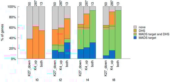 As MADS TFs were proposed to assist in opening chromatin, we analysed if the genes changing in histone marks from t0 to t2 would also change in their chromatin conformation as determined in Pajoro et al. [29] by assessing DNase I hypersensitivity (DHS, Figure 6, Figure S11B). Interestingly, about 40% or 60% of those DMGs are already located in DNase I hypersensitive (accessible) regions at t0. This is quite unchanged in t2 and the percentage of genes in open regions only increases slightly towards t4 and more towards t8. MADS binding seems to mainly affect other, still closed genes at t2, while a larger overlap between MADS binding and DHS is observed at t4 and even more at t8 (Figure 6).