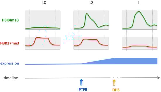 The temporal resolution brought by our dataset revealed that activation of a locus does rather not follow the canonically assumed order of events, with repressive marks being removed and active marks being added during transcriptional activation. Some studies had challenged this view in the past, at single gene level in plants. They report that transcription can take place while repressive marks are still present, and reduction in these marks was proposed to rather be a consequence of expression of the target gene [24,25,66]. Our genome-wide study shows that H3K4me3 is both quantitatively and temporally closely correlated with expression changes, while changes in H3K27me3 most likely require prior transcriptional changes to occur (Figure 7). This is in line with the recent report in mouse that re-establishment of H3K4me3 occurs more rapidly than that of H3K27me3 during activation of the zygote genome [67].