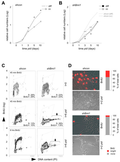- Fasano, C.A.; Dimos, J.T.; Ivanova, N.B.; Lowry, N.; Lemischka, I.R.; Temple, S. shRNA knockdown of Bmi-1 reveals a critical role for p21-Rb pathway in NSC self-renewal during development. Cell Stem Cell 2007, 1, 87–99. [Google Scholar] [CrossRef] [PubMed]