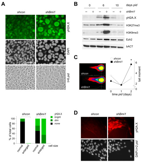 Activation of DNA damage response (DDR) in the absence of PRC1. (A) Representative IF images of yH2A.X staining in ATDC5 shcon and shBmi1 cells at t = 6 days pid (upper panels); corresponding DAPI and phase-contrast images (middle and lower panels), showing nuclei and whole cells, respectively; scale bar: 10 µm. Quantification of immunofluorescence (IF) data is depicted below the IF images; 23% of shBmi1 cells displayed an enlarged flat cell phenotype; all enlarged cells were positive for yH2A.X; (B) Comparative IB analysis of total cellular histone modifications yH2A.X, H3K27me3 and H3K9me3 levels in shcon and shBmi1 cells at indicated time-points pid; (C) Double strand breaks (DSB) in differentiating shcon and shBmi1 cells were determined by SCGE assay (neutral comet assay); representative images of shBmi1 and shcon comets at t = 2 days pid (left panel); quantification of tail moments (right panel; Asterisk (*): p < 0.001); (D) Representative IF images showing yH2A.X staining in shcon and shBmi1 HAC (human articular chondrocytes) cells at t = 6 days pid (upper panels); corresponding DAPI images (lower panel). For quantification of IF data, see: Figure S3G.