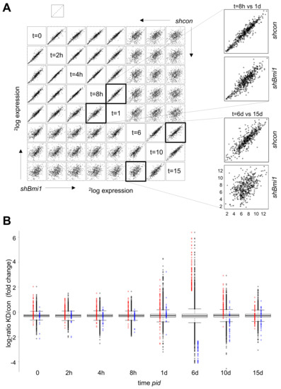 Abnormal transcriptional responses in BMI1-deficient cells. (A) Matrix display of scatter-plots of 2log expression values for all time-points relative to each other in shcon (upper right half) and shBmi1 cells (lower left half), based on reporters (i.e., mRNAs) fulfilling p < 0.05, absolute FC (fold change) ≥ 2, expression > 2log(100) in either group, at t = 1 or 6 days pid. Perfect fit to the identity line (see: dashed grey diagonal at the top of (A)) would indicate absence of differential expression between time-points). Insets: (upper) t = 8 h vs. 1 day and (lower) t = 6 days vs. 15 days pid. (B) FC for all reporters. Box-plots of shcon vs. shBmi1 log-ratios for all reporters (regardless of expression level, fold change or significance) for each time point in differentiation; colors red or blue retrospectively mark genes with a ≥4 FC up (red; n = 106) or down (blue; n = 49) at t = 6 days pid; box represents 1st–3rd quartiles; whiskers set at 1.5× interquartile distance.