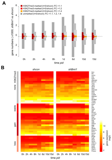 H3K27me3-independent transcriptional deregulation in the absence of BMI1. (A) Altered expression between t = 0 and 6 days pid is equally distributed over originally H3K27me3-enriched and non-enriched genes (i.e., in BMI1-proficient shcon cultures at t = 0). Bar graphs show the number of genes that are up- or down-regulated (above and below x-axis respectively) between t = 0 and 6 days pid, divided in H3K27me3-enriched and unmarked genes for three arbitrarily defined classes, based on gene expression fold change (FC) between shBmi1 and shcon (FC > 1.1, 1.2 or 1.4, respectively). Analyses was based on reporters with expression > log2(100). (B) Heatmap of representative marker expression for ‘Endochondral ossification’ (cf. Table S3) for shcon (left panel) and shBmi1 (right panel) ATDC5 cells. H3K27me3-enrichment status was defined based on ChIP-seq data comparison between t = 0 and 3 days pid in the shcon experiment: unmarked (none), stably marked (stable) or loci that had acquired (gain) or lost (loss) H3K27me3-marking (see Methods section for further definition of the marker set H3K27me3).