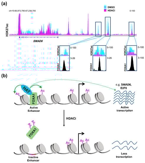 HDAC inhibition and FOXA1 at distal regulatory elements. (a) H3K27ac profiles in L3.6pl cells at SMAD6, a gene that is downregulated upon treatment with class I HDAC inhibitor (HDACi) showing distal regulatory regions that dramatically lose H3K27ac and co-localize with FOXA1 in the CFPAC1 pancreatic cancer cell line; (b) A schematic model showing an enhancer region activated by FOXA1 leading to acetylation of histones by a histone acetyltransferase (HAT), which leads to the activation of the gene. Upon treatment with HDACi, increased FOXA1 acetylation attenuates its binding to chromatin leading to downregulation of the gene. DMSO: Dimethylsulfoxide; HDAC: histone deacetylase; FOXA1: Forkhead Box A1. (See Appendix A for details of data analysis).