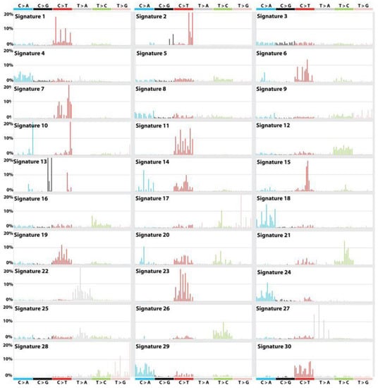 Mutational signatures across the spectrum of human cancer types. The profile of 30 mutational signatures displayed using the six substitution subtypes (i.e., C>A, C>G, C>T, T>A, T>C, and T>G), based on the actual trinucleotide frequencies of the reference human genome version GRCh37. The probability bars for each of the six types of substitutions and the mutated bases are displayed in different colors. The mutation types are displayed on the horizontal axes, while vertical axes depict the percentage of mutations attributed to a specific mutation type. Signature 2 found in 22 cancer types is attributed to activity of the AID/APOBEC family of cytidine deaminases. Signature 4 (found in head and neck cancer; liver cancer; lung adenocarcinoma; lung squamous carcinoma; small cell lung carcinoma; and, esophageal cancer), is attributed to tobacco carcinogens. Signature 3 (found in breast, pancreatic, and ovarian cancer), is strongly associated with germline and somatic BRCA1 and BRCA2 mutations. Fourteen mutational signatures are of an unknown etiology. Further details on each of 30 cancer signatures are described in COSMIC (https://cancer.sanger.ac.uk/cosmic/signatures).