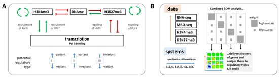 Schematic overview of the study design. (A) Aim of the study: Known interactions between transcription and epigenetic states that are characterized by the histone methylations H3K4me3 and H3K27me3 and DNA-methylation (DNAme) are indicated. We ask whether mutual dependence between transcription and epigenetics is mandatory (I), or whether an independent variability between both can be observed (II and III). Pol II: RNA polymerase II, HMT: histone methyltransferase; and (B) For this purpose, published [21] transcriptome (RNA-seq) and epigenetic (H3K4me3 and H3K27me3 ChIP-seq and MBD-seq) data of four states of ISC specification and differentiation (progenitors at embryonic days E12.5 and 14.5; ISCs; aEC) were re-analyzed using a combinatorial SOM. Subsets of genes were assigned to regulation types I, II or III.
