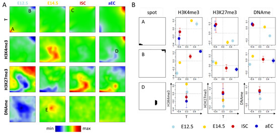 Additional details of the T-H3K4me3 SOM. (A) Shown here are the transcription portrait of the T-H3K4me3 SOM and the SCOV portraits of the T-H3K4me3 SOM, the T-H3K27me3 SOM and the T-DNAme SOM. H3K4me3 and H3K27me3 show the expected positive and negative correlation with transcription, respectively. DNA methylation shows a negative correlation except for progenitors at E.12, where positive correlation is also observed; and (B) In ISCs spot C genes are transcribed higher than in all other cell types. However, the epigenetic profiles are very similar. Spot E genes show a hypo-methylation in progenitors of E12.5 and a hyper-methylation in those of E14.5, indicating rapid DNA methylation changes during these two days.