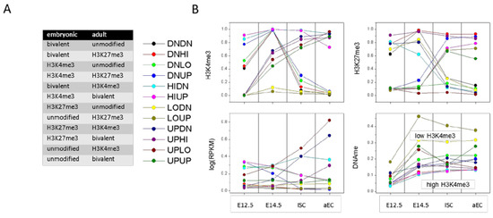 Figure 5 shows the average regulatory profiles of all transition states. Obviously, the recruitment of H3K4me3 already occurs in progenitors at E14.5, while the loss of H3K4me3 and changes of the H3K27me3 level are seen predominantly in ISCs. In agreement with the protective function of H3K4me3 against promoter DNA methylation, highest (lowest) values for this type of DNA methylation are seen for genes with stable low (high) H3K4me3. On average, the subsets of genes that carry H3K4me3 in embryonic progenitors and lose it in adult cells are lower transcribed than those of the subsets that gain H3K4me3 in the adult cells.