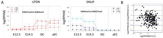 Similar epigenetic regulation at different transcription levels. (A) Average transcription behavior of transition set subsets UPDN (H3K27me3 to H3K4me3) and DNUP (H3K4me3 to H3K27me3). Similar behavior was clustered, considering all three replicates independently (mean, sd). The cluster size is indicated. Higher absolute transcription changes are seen for genes with an initially higher transcription; and (B) Transcription fold changes between the adult ECs and progenitors at E12.5 are not correlated with the initial transcription in progenitors at E12.5 (DNUP set, H3K4me3 to H3K27me3).