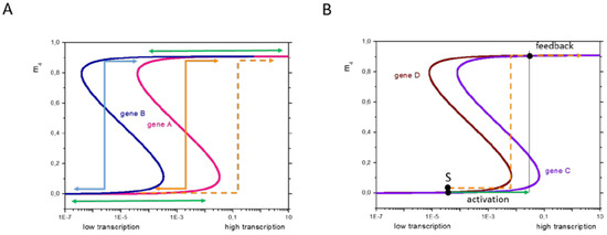 According to these considerations, the dependence of H3K4me3 on the transcription is described by an S-shaped curve (Figure 4, H3K27me3 by a Z-shaped curve). This shape has also been observed experimentally [2]. For low transcription, the modification level mK varies only slightly with T, and thus can be considered as being independent. The same applies to high transcription values. Thus, these regions are associated with regulation of type III. In case the transcription is increased above T2 (decreased below T1) for low (high) transcription, both transcription and the modification state change, i.e., regulation of type I takes place. In the case a gene is transcribed in the range of bi-stability (Figure 4, three solutions exist for m, the intermediate state is unstable), a temporary change of its transcription level can enforce a modification switch. After systems relaxation, only an epigenetic change will be detected and the effective regulation is classified as type II.