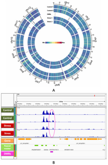 Identification of differentially methylated regions (DMRs) between control and salt stress samples in a salt-tolerant rice variety. (A) A genome-wide view of DNA methylation of Pokkali leaves. The circos plot representation was used to show the location of DMRs between control and salt stress conditions. The circos plot was based on the average RPM over 100,000 bp windows. (B) An example of a DMR (DMR 2) (pink bar and circle) exhibiting lower levels of DNA methylation in salt stress than in control conditions. The annotation of genes and repetitive sequences physically related to DMR is shown at the bottom. All the DMRs identified are shown in Figure S2.