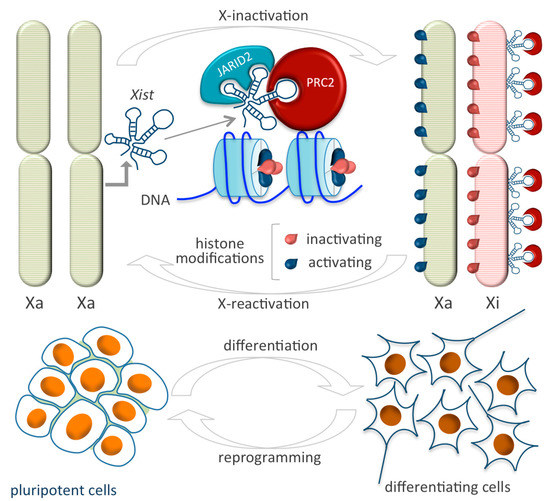 - da Rocha, S.T.; Boeva, V.; Escamilla-Del-Arenal, M.; Ancelin, K.; Granier, C.; Matias, N.R.; Sanulli, S.; Chow, J.; Schulz, E.; Picard, C.; et al. Jarid2 is implicated in the initial xist-induced targeting of prc2 to the inactive x chromosome. Mol. Cell 2014, 53, 301–316. [Google Scholar] [CrossRef]