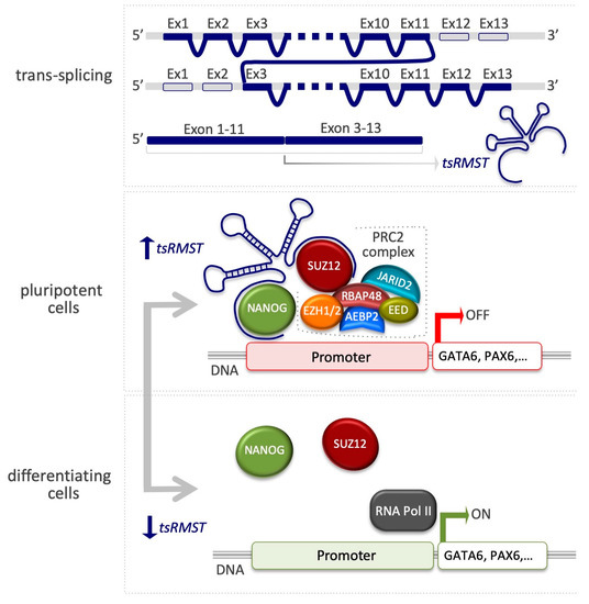Alternative splicing, which arises from post-transcriptional events, can lead to the generation of multiple transcript isoforms from a single gene, thus providing an essential source of diversity for the transcriptome and proteome [109,110,111,112,113]. Splicing can occur either in cis or in trans [114,115]. A single pre-mRNA is originated by cis-splicing of exons, whereas two or more separate pre-mRNAs are derived either from the same gene or from two or more different genes by intragenic and intergenic trans-splicing, respectively. Trans-splicing is largely detected by comparing reference genomes with expressed sequence tags (ESTs)/mRNAs [116,117,118,119] or by the NGS of mRNAs (RNA-seq) [120,121,122,123]. However, these kinds of approaches generate a significant number of false positives. To tackle this issue, a computational pipeline named TSscan, based on transcriptome sequencing data from different NGS platforms and several undifferentiated hESC lines was developed, and confirmed that four trans-splicing events (tsCSNK1G3, tsARHGAP5, tsFAT1, tsRMST) occur in hESCs [95]. All four trans-spliced RNAs are also expressed in human iPSCs, suggesting that these events tend to occur in human pluripotent stem cells. Of particular interest is tsRMST, the first trans-spliced lincRNA to be identified, which is highly expressed in both hESCs and iPSCs, and whose expression is reduced after in vitro hESC differentiation, suggesting the possibility that tsRMST is specifically expressed in pluripotent stem cells, and may thus play a role in pluripotency maintenance. Microarray-based genome-wide expression profiling performed on tsRMST knockdown hESCs showed that the expression levels of pluripotency-associated genes such as NANOG, POU5F1, and SOX2 were significantly decreased, whereas key lineage-specific TFs such as GATA6 (endoderm) and PAX6 (neuroectoderm) were induced [95]. At the mechanistic level, RIP analysis showed that tsRMST interacts directly with SUZ12 (Figure 3 and Table 1) and NANOG. In line with these results, chromatin immunoprecipitation qPCR experiments on tsRMST promoters repressing lineage-specific genes (GATA6 and PAX6) further showed the loss of NANOG and SUZ12 occupancy, as well as H3K27me3 modification in tsRMST knockdown hESCs (Figure 3) [95]. A model was proposed in which tsRMST suppresses lineage differentiation in hESCs via recruitment of NANOG and PRC2 [95] and plays a regulatory role in noncanonical Wnt signaling [124].