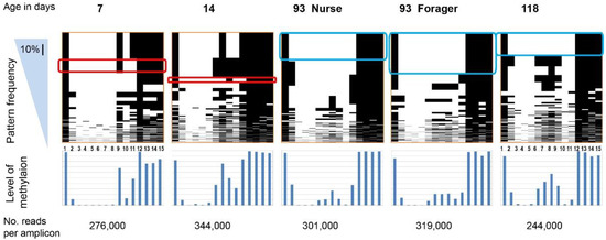 All methylation patterns for 15 CpG sites in the nadrin amplicon revealed by Illumina MiSeq; “Frequency” denotes the pattern sorting direction (i.e., most frequent patterns at the top). The scale bar in the blue triangle corresponds to 10% of all patterns. The lower panel shows the combined methylation level for each CpG. The rounded red and blue rectangles indicate selected identical patterns between two or three situations. The age of the bees used is shown above the top panel (see Table 2 for a full description of the biological material). For details on the nadrin gene structure and amplicon localisation, see Figure S1 and Table 1. The number of reads per amplicon is indicated at the bottom.
