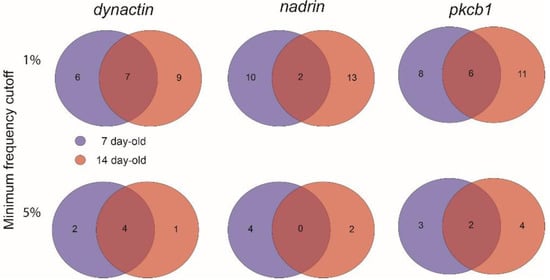 A 2-way Venn diagram showing the number of unique and overlapping patterns for dynactin, nadrin and pkcb1 in 7-day-old and 14-day-old bees (1% and 5% minimum frequency cut-off).