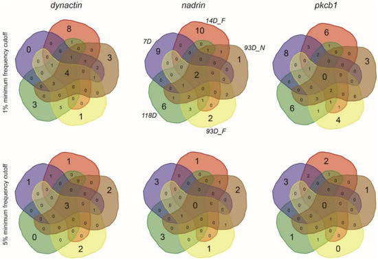 Symmetrical Venn diagrams showing the number of unique and overlapping patterns for dynactin, nadrin and pkcb1 from all the analysed conditions (1% and 5% minimum frequency cut-off).