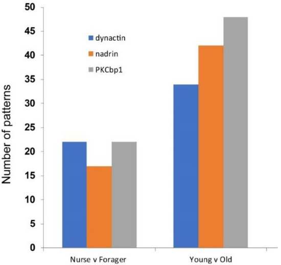 Number of cumulative patterns for dynactin, nadrin and pkcb1 with a minimum 1% frequency, 2-way comparisons: nurses versus foragers (all 93-day-old bees) and young bees (combined 7- and 14-day-old bees) versus old bees (combined 93-day-old nurses and foragers and 118-day-old bees).