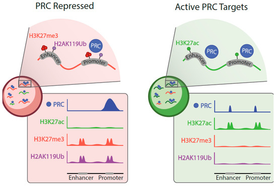 ChIP experiments studying the localization of PRC1 often include the core subunit RING1B, and variably other subunits from canonical and variant PRC1 complexes. The presence of PRC2 proteins, in contrast, is much less studied. Polycomb-induced histone modifications, H3K27me3 and H2AK119Ub, usually found at repressed targets are, generally, absent. This is documented for Drosophila cell lines and imaginal discs [124,129] or in the murine system, in lymphoid [127], germinal [136], epidermal cells [138,139], hematopoietic progenitors, and their derived erythroid cells [132,144]. Polycomb-bound active targets in transformed mammalian cell lines also lack H3K27me3 and H2AK119Ub [135,140]. In contrast, many of these active targets are enriched in H3K27ac, a modification that together with H3K4me1 is typically associated to active enhancers [95,145]. Nevertheless, exceptions showing H3K27me3 on select active targets have been reported in neural and mesodermal progenitors derived from ESCs [128,133]. The effects of enforced decreases of H3K27me3, trough depletion of PRC2 products, shows minimal impact on active targets in imaginal discs or epidermal progenitors [124,138,139]. However, the wide down-regulation effect seen in EZH1-defficient erythroid cells, is unrelated to H3K27me3 because the prevalent PRC2 complex in these cells (lacking EED) is enzymatically inert [132].