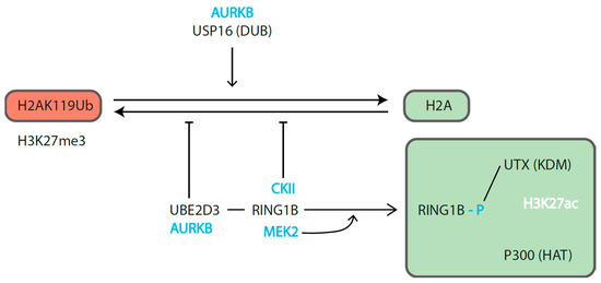 Kinases are among the regulators that can flip RING1B roles (Figure 3). RING1B phosphorylation can inhibit its E3 ligase activity or affect its ability to associate direct or indirectly with proteins. For example, in resting peripheral B cells, Aurora B kinase (AURBK)—a kinase well known by its involvement in mitosis—indirectly inhibits RING1B E3 ligase activity through phosphorylation of ubiquitin-conjugating enzyme UBE2D3 [127]. At the same time, the deubiquitinase USP16 is phosphorylated to promote its deubiquitinase activity. The overall effect can be one of the efficient reduction of H2AK119Ub on promoter proximal nucleosomes. Direct down modulation of RING1B E3 ligase activity is also associated to its phosphorylation (at S168) by casein kinase II (CKII), a subunit regularly present as part of PRC1.5 complexes that in some cells include AUTS2, a subunit that can recruit histone acetylase (HAT) p300 [131]. Alternatively, posttranslational modifications of RING1B can affect its ability to associate direct or indirectly with proteins involved in transcriptional activation such as HAT p300 and histone H3K27 demethylases (KDM6A/UTX), as seen by MEK1 phosphorylation of RING1B S41 [134].