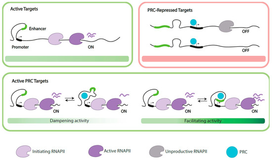Simplified representation of cis regulatory elements at extended PRC targets. Depicted scenarios include active, not PRC-regulated targets (top, left), and PRC-repressed targets (top, right) as extreme scenarios, showing promoter proximal and elongating forms of productive RNA polymerases (RNAPII), in contrast with low/undetectable levels of mRNA at PRC-repressed targets, where RNAPII is in an unproductive form. Below, two possibilities of active PRC targets. In both cases, expression dampened (left) or facilitated (right) is interpreted as the outcome of the abilities of PRC proteins, together with uncharacterized factors, to modulate the communication between enhancers and promoters. Fine tuning of expression at these targets is illustrated as switching scenarios where PRC impairs such contacts to decrease overall promoter output (dampening activity), in contrast with the promotion of the contacts leading to sustained expression (facilitating activity). Target identities, accessory factors and available Polycomb products (cell context) are probable determinants of one or another function on these active targets.