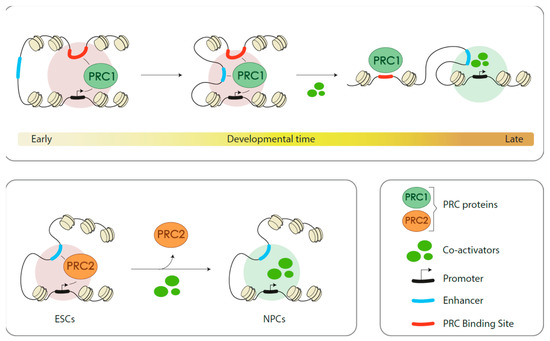 PRC topological activities are required for gene activation. Two situations are depicted, corresponding to reported cases where gene activation along differentiation pathways depends on the presence of PRC complexes. One, at the top, corresponds to configurations of the embryonic Meis2 locus throughout development [157]. Three-dimensional contacts, dependent on RING1B, evolve from the repressed state, left, where the enhancer cannot interact with the promoter, to the active state, where communication enhancer-promoter is effective, progressing through an intermediate state previous to the (assumed) involvement of DNA binding proteins and other factors required for gene activation. The second example, below, corresponds to configurations of one of the loci encoding anterior neural genes [158]. A major difference with the previous scenario is that, in the repressed state, in ESCs, enhancers (poised) are contacting the promoter, in a PRC2-dependent manner. The contacts as such, are not relevant to the transcriptional state, however, these are required for effective response to differentiating cues NPCs.