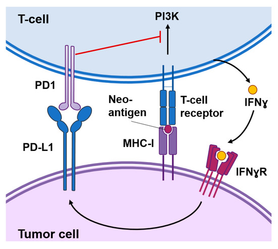 Functional interactions between cancer cells and T-cells. Cancer-specific antigens or neoantigens expressed in tumor cells processed and presented by the MHC-I system will be recognized by T-cell receptors present in the surface of T-cells. This interaction activates signaling cascades causing T-cell activation. Activated T-cells produce interferon (IFN)γ that among other responses induces the expression of the programmed death-ligand 1 (PD-L1) in tumor cells. The interaction of PD1 with PD-L1 inhibits signal transduction pathways involved in T-cell activation.