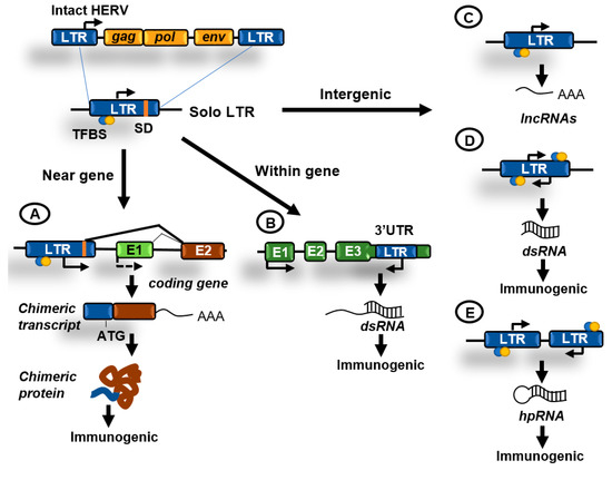 Contributions of human endogenous retroviruses (HERVs) to genome regulation. Original HERVs inserted in the human genome frequently suffered recombination between 5′ and 3′ LTR generating solo LTRs. These solo LTRs might contain transcription factor binding sites (TFBS), transcription start sites (TSS), and splicing donor (SD) sequences and might impact cellular functions in the following ways. (A) LTRs in the proximity of genes might function as enhancers or alternative promoters. Functioning as promoters they can generate chimeric transcripts that can be translated giving rise to potentially immunogenic proteins; (B) LTRs have been also located at the 3′UTR region of coding genes and might be transcribed antisense to these genes generating double-stranded RNA (dsRNA); (C) transcription initiated from an isolated LTR can generate long non-coding RNAs (lncRNAs); (D) isolated LTRs can also undergo bidirectional convergent transcription and generate dsRNA; (E) inverted repeats can generate hairpin RNA (hpRNA) after transcription. hpRNAs are commonly generated by inverted Alu or LINEs repeats. dsRNAs can be immunogenic by activating innate immunity pathways.