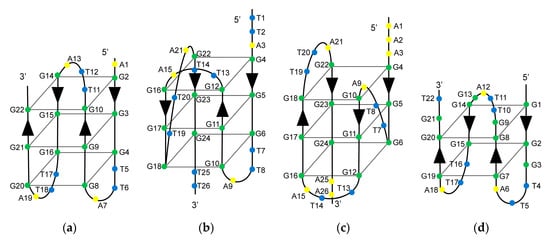 Several distinct intramolecular G4 structures that formed by telomeric oligonucleotides have been reported. These structures contain 21-mer telomeric core sequence d[GGG(TTAGGG)3] in the center, and the G4 structures that formed depend on the flanking sequences and available cations [25]. In the presence of Na+, the wild-type of 22-mer telomeric oligonucleotide d[AGGG(TTAGGG)3] (A-Tel21) formed an intramolecular antiparallel basket-type G4 structure (Figure 1a) [26]. In the presence of K+, the wild-type of 26-mer telomeric oligonucleotide d[(TTAGGG)4TT] (TTA-Tel21-TT) and 25-mer telomeric oligonucleotide d[TAGGG(TTAGGG)3TT] formed an intramolecular hybrid-type G4 structure called Form-2/Hybrid-2 (Figure 1b) [27,28]. In contrast, the wild-type of 23-mer telomeric oligonucleotide d[TAGGG(TTAGGG)3] predominantly formed a distinct intramolecular hybrid-type G4 structure known as Form-1/Hybrid-1 (Figure 1c), in which the structures were determined by using mutant telomeric oligonucleotides d[TTGGG(TTAGGG)3A] [29], d[AAAGGG(TTAGGG)3AA] (AAA-Tel21-AA) [30,31], and 8-bromoguanine modified telomeric oligonucleotide [32] in the presence of K+. Moreover, the wild-type of 22-mer telomeric oligonucleotide d[GGG(TTAGGG)3T] (Tel21-T) predominantly forms an intramolecular antiparallel basket-type G4 structure with two G-tetrads, which is known as Form-3 (Figure 1d), for which the structure was determined by using 8-bromoguanine-modified telomeric oligonucleotides [33] and guanine-to-inosine substituted telomeric oligonucleotides [34].