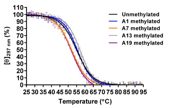 Circular dichroism (CD) melting of the unmethylated, A1-, A7-, A13- and A19-methylated G4 structures that formed by A-Tel21 (20 μM) in 7.4 mM NaH2PO4, 17.6 mM Na2HPO4, and 57.4 mM NaCl (pH 7.0) (n = 3; mean ± SD).