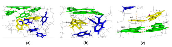 N6-monomethyladenine exists in two isomers, depending on the location of the methyl group on N6 in solution [21,22]. The first is a syn isomer for which the methyl group is located on the N1 side, and the other is an anti-isomer for which the methyl group is located on the N7 side of the base. The syn isomer is more stable than the anti-isomer; therefore, a hydrogen bond formation involving a hydrogen atom at N6, which is on the N1 side of the base, is inhibited by methylation. A solution structure for the antiparallel basket-type G4 structure that formed by A-Tel21 in Na+ has been revealed by nuclear magnetic resonance (NMR) [26]. A hydrogen atom at N6 on A7, which is located on the N1 side of the base, is involved in a hydrogen bond formation in four out of six structures (Figure 3a). Similarly, the hydrogen atom is involved in a hydrogen bond formation in five out of six structures on A19 (Figure 3b). These results indicate that m6dA modifications at A7 and A19 would disrupt these hydrogen bond formations, thereby reducing the thermal stability of the G4 structure. A hydrogen bond is formed on A13 in only one out of six structures, which suggests that the hydrogen atom at N6 is not significantly involved in hydrogen bond formation. In contrast, A13 stacks with G22, which is involved in a G-quartet formation (Figure 3c). The m6dA modification increases the stacking interaction [23]; therefore, m6dA modification at A13 would enhance the stacking interactions between A13 and G22 to increase the thermal stability of the G4 structure.