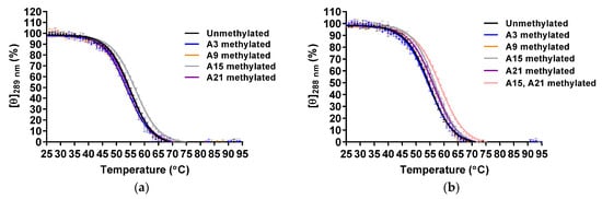 CD melting of the unmethylated and A3-, A9-, A15- and A21-methylated Form-2 (a) and Form-1 (b) G4 structures (20 μM) in 8.0 mM KH2PO4, 17.0 mM K2HPO4, and 58.0 mM KCl (pH 7.0) (n = 3; mean ± SD).