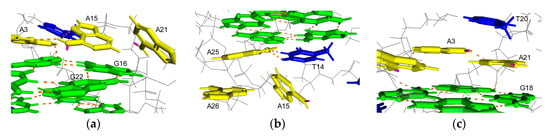 In the solution structure for the Form-2 G4 structure that formed by TTA-Tel21-TT, a hydrogen atom at N6 on A15, which is located on the N7 side of the base, is involved in a hydrogen bond formation in eight out of ten structures, whereas a hydrogen atom on N6, which is located on the N1 side of the base, is involved in a hydrogen bond formation in only four out of ten structures [28]. These results suggest that m6dA modification at A15 would not mainly affect the hydrogen bond formation. In contrast, A15 stacks G16, which is involved in a G-quartet formation, which suggests that m6dA modification at A15 would enhance the stacking interactions, thereby increasing the thermal stability of the G4 structure (Figure 5a). In the solution structure of the Form-1 G4 structure that formed by AAA-Tel21-AA, hydrogen atoms at N6 on A15 and A21 are not involved in a hydrogen bond formation [31]. In contrast, A15 locates onto T14, which stacks the bottom G-quartet (Figure 5b), and A21 stacks T20 and G18, which are involved in the G-quartet formation (Figure 5c). These results suggest that m6dA modification at A21 would enhance stacking interactions, and m6dA modification at A15 may induce stacking interactions between T14 and A15.