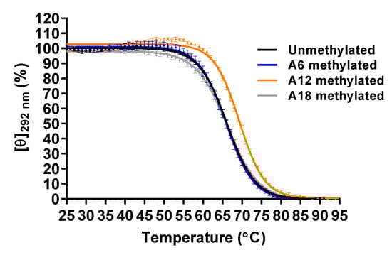 The thermal stabilities were analyzed by CD melting using molar ellipticity at 292 nm. The Tm value of the unmethylated Tel21-T was 66.1 ± 0.1 °C, which was higher than that of Form-1 and Form-2, as was previously reported (Figure 6 and Table 3) [33]. The Tm values of A6-, A12-, and A18-methylated Tel21-T were 66.0 ± 0.5 °C, 69.5 ± 0.3 °C, and 66.0 ± 0.3 °C, respectively. Native PAGE analysis indicated that these oligonucleotides folded into a monomer structure (Figure S8). These results demonstrated that A12-methylation increased the thermal stability of the G4 structure, whereas A6- and A18-methylation did not affect it.