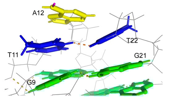In the solution structure of the Form-3 G4 structure that formed by 8-bromoguanine modified Tel21-T, a hydrogen atom at N6 on A12 is involved in a hydrogen bond formation in one out of ten structures, which suggests that m6dA modification at A12 would not significantly affect hydrogen bond formation [33]. In contrast, A12 stacks the T11-T22 base pair, which stacks the base triple formed by G9, G13, and G21, which suggests that m6dA modification at A12 would enhance the stacking interactions to increase the thermal stability of the G4 structure (Figure 7).