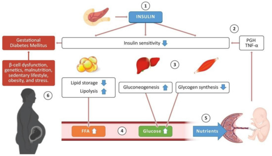 Schematic representation of the glucose-insulin metabolism in pregnancy. The pancreas releases insulin, which promotes different processes in some tissues to regulate glucose concentration in the bloodstream (1). During a healthy pregnancy, the placenta produces the placental growth hormone (PGH) and proinflammatory cytokines such as tumor necrosis factor-alpha (TNF-α), promoting a decrease in insulin sensitivity in adipose tissue, liver, and skeletal muscle (2). Consequently, adipose tissue stops lipid storage and activates lipolysis; the liver enhances the production of endogenous glucose (gluconeogenesis), and glycogen synthesis decreases in skeletal muscle (3). These processes promote an increase in free fatty acids (FFA) and glucose concentration in the bloodstream (4), which are required as nutrients for the development of the placenta and the fetus (5). Nevertheless, some pregnant women present risk factors that trigger the development of gestational diabetes mellitus (6). Some images in this figure were taken from https://biorender.com/ (last accessed on 25 March 2021).