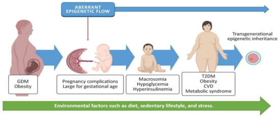 GDM and obesity are chronic diseases often present in pregnant women. These may induce an aberrant epigenetic flow, triggering pregnancy complications and postnatal metabolic disorders for the baby, such as macrosomia, hypoglycemia, and hyperinsulinemia. Environmental factors (such as diet, activity, or stress) may increase the incidence of type 2 diabetes mellitus (T2DM), obesity, cardiovascular diseases (CVD), and metabolic syndrome; they may also promote the inheritance of aberrant epigenetic marks. Some images in this figure were taken from https://biorender.com/ (last accessed on 25 March 2021).
