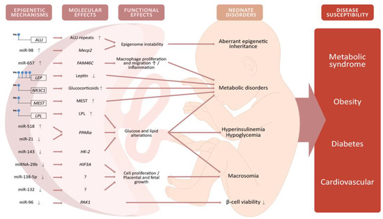 Alterations of DNA methylation and miRNA expression in the placenta from women with GDM will alter the expression and function of genes involved in metabolic and cellular pathways. These alterations will have potential implications for the offspring such as hyperinsulinemia, hypoglycemia, macrosomia, and lower viability of pancreatic β-cells. These neonate disorders may, in turn, produce an increased susceptibility to developing obesity, diabetes, metabolic syndrome, and cardiovascular diseases later in life. Some images in this figure were taken from https://biorender.com/ (last accessed on 25 March 2021).
