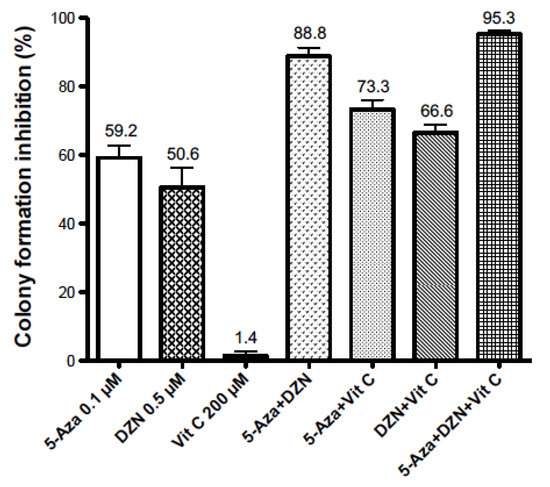 Statistical analysis: 5-Aza + DZN > 5-Aza or DZN, p < 0.01; 5-Aza + Vit C > 5-Aza, p < 0.05; 5-Aza + Vit C > Vit C, p < 0.01; DZN + Vit C > DZN, p < 0.05; DZN + Vit C > Vit C, p < 0.01; 5-Aza + DZN + Vit C > 5-Aza + Vit C, p < 0.01; 5-Aza + DZN + Vit C > 5-Aza + DZN (non-significant).