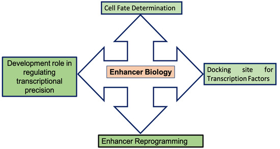 The term “enhancer” was first coined based on studies of Simian virus 40 (SV40) when, in 1981, Banerji et al. observed for the first time that a viral DNA element from SV40 had the ability to enhance activity towards a T-antigen or β-globin reporter in mammalian cells [1]. Further research has explored endogenous sequences with similar functions in the immunoglobulin heavy chain locus. These preliminary studies have established that enhancers function as short DNA elements that trigger a gene’s transcription from a long distance in an orientation-independent manner. Preliminary studies have determined the exact mechanism of how distal regulatory elements regulate gene transcription through distal enhancers [2]. Enhancers are cis-regulatory elements that carry epigenetic information in DNA sequences through specific histone modifications [3]. Studies assessing the characteristics of enhancers have reported that they can function independently of the orientation and distance to their cognate target genes, at distances sometimes of several hundred kilobases or megabases [2,4,5]. Enhancers can be identified and characterized by various factors, including histone modifications, their transcription into non-coding RNAs, and their epigenetic features [6]. The prominent feature of enhancers is their ability to serve as a docking platform for transcription factor binding, where developmental signaling (intrinsic or extrinsic) cues are interpreted in a highly context-specific manner [7]. The signatures of these enhancers are highly cell type-specific; such cell type-specific use of the epigenetic information has demonstrated the combinatorial function of transcription factors in maintaining cell identity and lineage determination [8]. The cell type-specific enhancer pattern provides a unique cis-regulatory platform, in which transcription factors are activated by developmental cues and modify the transcriptome [9,10,11]. This model revealed that every developmental stage has a cell type-specific transcription factor, which functions by cell type-specific enhancer signatures [12]. Enhancers are actuated in a stage-specific manner, correlated with cell type-specific histone modifications. This combinatorial mechanism of transcription factor binding on cell type-specific enhancers results in the so-called enhancer signature, which serves as a readout to define enhancers in a cell type-specific manner at a global scale [13]. Precise spatial and temporal control of gene expression and the correct interpretation of the enhancer signature are crucial in the development process. Any alterations in the enhancer signature can modify the gene expression pattern and ethe capacity of the enhancer to respond to developmental signals, narrowing cell differentiation and affecting correct lineage formation. Heinz et al. (2010) have shown that lineage-determining transcription factors bind to a genomic region in a cell-specific manner. They showed the genome-wide locations of PU.1 binding patterns in macrophages, B-cells, and diffuse B-cell progenitors [14]. Similarly, Xu et al. (2012) analyzed chromatin state maps, transcription factor occupancy rates, and gene expression profiles during the development of human erythroid cells at the fetal and adult stages, and carried out a comparative analysis to determine the specific procedures of the development stage [15]. Here, it is also important to discuss the study of Choukrallah et al. (2015), who found that the enhancer landscape is dynamically reshaped in each differentiation step. Interesting changes include creating new enhancers and the closing and re-opening of the pre-existing enhancer landscape [16]. The authors also reported that the regulatory signatures of two related types of myeloid leukemia expression fusion proteins (RUNX1-ETO and RUNX1-EV1) display a distinct binding pattern and interact with different transcription factors to impact the epigenome [17]. A study has also reported that MLL-Af9 and MLL-AF4 oncofusion proteins showed distinct binding patterns in the enhancer region and targeted the RUNX1 program in 11q23 acute myeloid leukemia [18]. Enhancers are essential for normal functioning, and the loss of enhancer elements can cause abnormalities; for example, Groschel et al. (2014) showed that the removal of the distal enhancer essential for the GATA2 gene resulted in insufficient Functional GATA2 haploids, which only reduced the expression of the remaining normal alleles [19]. This review focuses on a concise and brief overview of the roles of enhancers in development and disease. We attempt to discuss how enhancers are activated and coordinated with transcription factors, as well as the roles of enhancers in mammalian development. This may comprise the first attempt to compile recently published research on development and disease, focusing on enhancers.