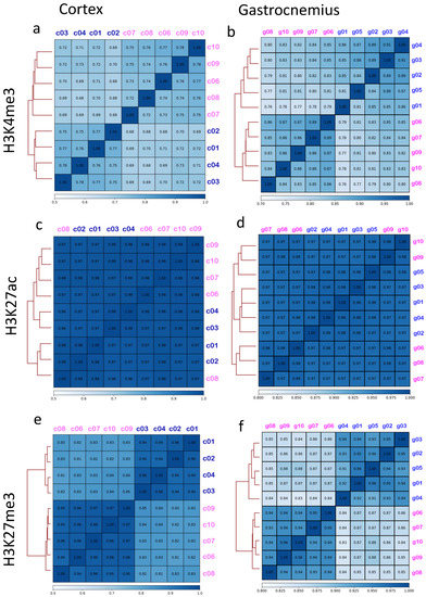 Spearman correlation including autosomes and X chromosome. Spearman correlation heatmap including chromosomes 1-19 and X for H3K4me3 (a), H3K27ac (c), and H3K27me3 (e) from cortexes are represented in the graphs on the left side. Corresponding graphs from gastrocnemius, for H3K4me3 (b), H3K27ac (d), and H3K27me3 (f), are reported on the right side. Male IDs are indicated in blue, female IDs are in pink. The color within each cell represents the Spearman coefficient which ranges from 0.68 to 1 (maximal correlation).