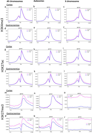Focusing on the analysis of the average signals on TSS separating autosomes and the X chromosome, the intensity of the H3K27me3 signal on the X chromosome scored almost double in females than males in both cortex and gastrocnemius (Figure 2o,r). In the gastrocnemius, a slight difference in the H3K27me3 signal on TSS was also found if considering only the autosomes. Differences in the H3K27ac signal on TSS also appeared on the X chromosome of gastrocnemius.