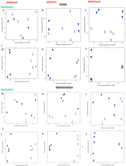 To investigate the heterogeneity in these sets of peaks among samples, principal component analyses (PCA) were performed. Results revealed that females and males separate only if considering the X chromosome (Figure 4d–f,j–l), with the principal component 1 showing the maximum variance for H3K27me3 (96% for both tissues) (Figure 4f,l) and the minimum for H3K27ac (around 55/59%) (Figure 4e,k). PCA for the H3K4me3 X chromosome resulted in a more variable component 1 between the two sexes, with a higher variance shown by cortexes (78%) (Figure 4d,j). Taking in account autosomes, male and female H3K4me3 and H3K27ac differentially marked peaks appeared and merged for both tissues (Figure 4a,b,g,h).