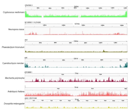 Chromosome-wide distribution of H3K27me3 in different model species [Cryptococcus neoformans (ASM1180120v1/PRJNA261445) [], Neurospora crassa (NC12/PRJNA192863) [], Phaedactylum tricornutum (ASM15095v2/PRJNA282957) [], Cyanidioschyzon merolae (ASM9120v1/PRJNA362822) [], Marchantia polymorpha (ASM993635v2/PRJNA553138) [], Arabidopsis thaliana (TAIR10/PRJNA277409) [], Drosophila melanogaster (PRJNA379297) []. Genome reference and accessions are given in brackets. Here, the publically available data were downloaded, cleaned by removing the library adapters, small reads (30), and low-quality (20) reads using Trim galore []. To map the sequenced data, Bowtie2 [] was used with default parameters. Only mapped reads were kept with a quality threshold of 25. The filtering was performed using SAMTOOLS []. For the visualization of the data, IGV [] was used, and for the parsing of the BAM files to BW files, BamCoverage—deeptools [].