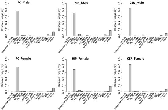 Analyzing the GC content of ncRNAs often gives the first approximation of potential differences in their nucleotide composition. We calculated the GC content of ncRNA reads by dividing the G and C count by the total nucleotide count in ncRNA reads. Not many differences were found in GC content of most reads, but the GC content of reads mapping to antisense ncRNAs in females differed from those in males; in males ~55–60% in all three brain regions tested, whereas in females ~32% in FC, ~55% in HIP, and ~42% in CER (Figure S2). The difference in GC content in these ncRNAs in FC and CER may likely indicate the sex-specific difference in the composition of these ncRNAs and in their function.