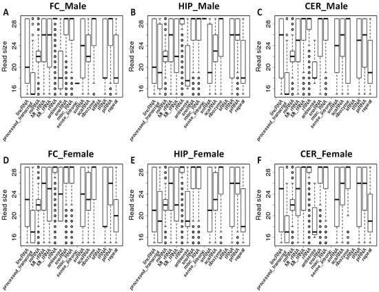 We then analyzed the read size distribution among different classes of ncRNAs. The differences in the median size of reads were observed in those mapping to lincRNAs, mt-RNAs, snRNAs, antisense ncRNAs, and tRNAs. Specifically, lincRNAs reads were comparable in size between FC and HIP—~20 nt, whereas the size of lincRNA reads in CER was significantly larger than in FC or HIP—~26 nt in males (p < 0.05 for both); the differences between male and female were not significant (Figure 2). Reads mapping to snRNAs in HIP of both males and females were 19–21 nt, whereas in FC and CER they were significantly different, with the median of 24–25 nt (p < 0.05 for both). Reads mapping to antisense ncRNAs were significantly larger in females than in males in FC (p < 0.05). The median size of reads mapping to tRNA was 18 nt in FC of both males and females, significantly smaller than the median size in HIP and CER of 26 nt (p < 0.05 in all cases). No significant difference was observed in reads mapping to processed_transcript, miRNA, Mt_rRNA, rRNA, snoRNA, miscRNA, ribozyme, scaRNA, piRNA, and repeat-associated ncRNAs.