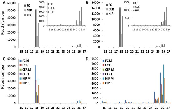 We then analyzed the distribution of ncRNA read size and found no difference between different brain parts or between males and females—22 nt was a predominant fraction in all regions of the brain in both sexes (Figure S1). This is likely because reads predominantly mapped to miRNAs, which are ~22 nt in size on average (Figure 1). A comparison of different brain regions showed that the smallest fraction of miRNAs was in HIP, while the largest was in CER. Specifically, miRNA fractions in males were ~77%, 70%, and 83% in FC, HIP, and CER, respectively; it was similar in females ~77%, 68%, and 84% in FC, HIP, and CER, respectively. The second-largest fraction of ncRNA reads was reads associated with repetitive elements. Fractions of reads associated with tRNA, rRNA, snoRNA, and snRNA were smaller than 2–3%.