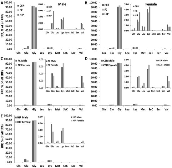 Analysis of tRF by their mapping to different tRNAs. Comparison of percentage of reads mapping to different tRNAs between different brain regions in male (A) and female (B). Since reads mapping to Gly were predominant, we generated another figure omitting Gly reads—see the inserts. (C–E) show male to female comparison for FC, CER and HIP brain regions, respectively. The Y-axis shows the percentage of reads for each specific group. The X-axis shows the tRNA the reads mapped to.