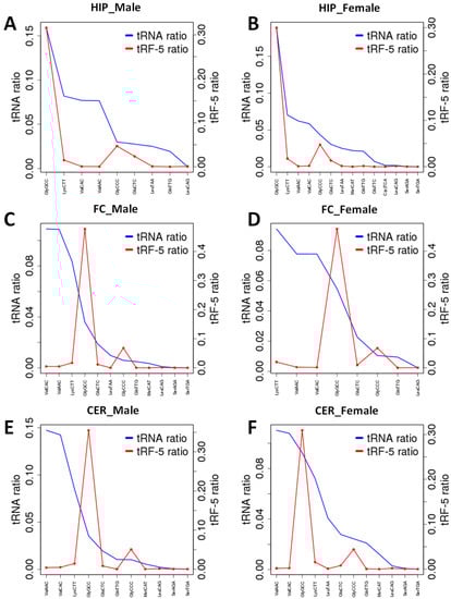 Enrichment of tRFs produced from tRNAs in various brain regions. (A) “FC_Male”—frontal cortex of male rats; (B) “HIP_Male”—hippocampus of male; (C) “CER_Male”—cerebellum of male; (D) “FC_Female”—frontal cortex of female rats; (E) “HIP_Female”—hippocampus of female; (F) “CER_Female”—cerebellum of female. The Y-axis shows specific tRNA and tRF-5 ratios for specific tRNAs and t-RFs relative to all. When the t-RF peak is larger than the tRNA peak, there is an enrichment, while when it is lower, there is underrepresentation.